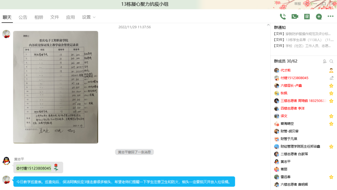 从11月11日至今,我与另外4名教师志愿者组成临时党支部入驻学生楼栋,在学生严格遵守足不出户期间,为学生送饭送水送药送物资陪同上门核酸;在学生可以出楼栋活动后,又承担起行政督导和教学巡查工作,每天至少巡查30个学生寝室,及时了解和帮助解决学生在学习和生活中的问题。