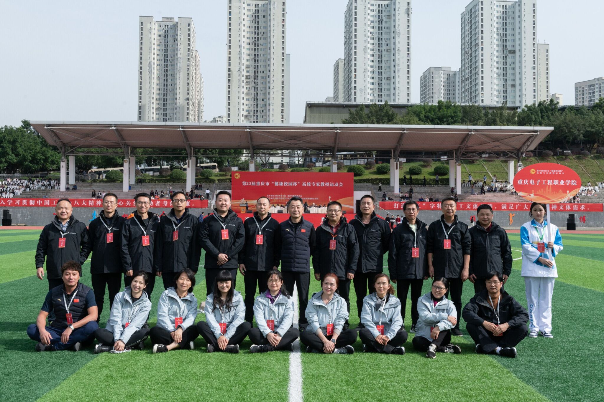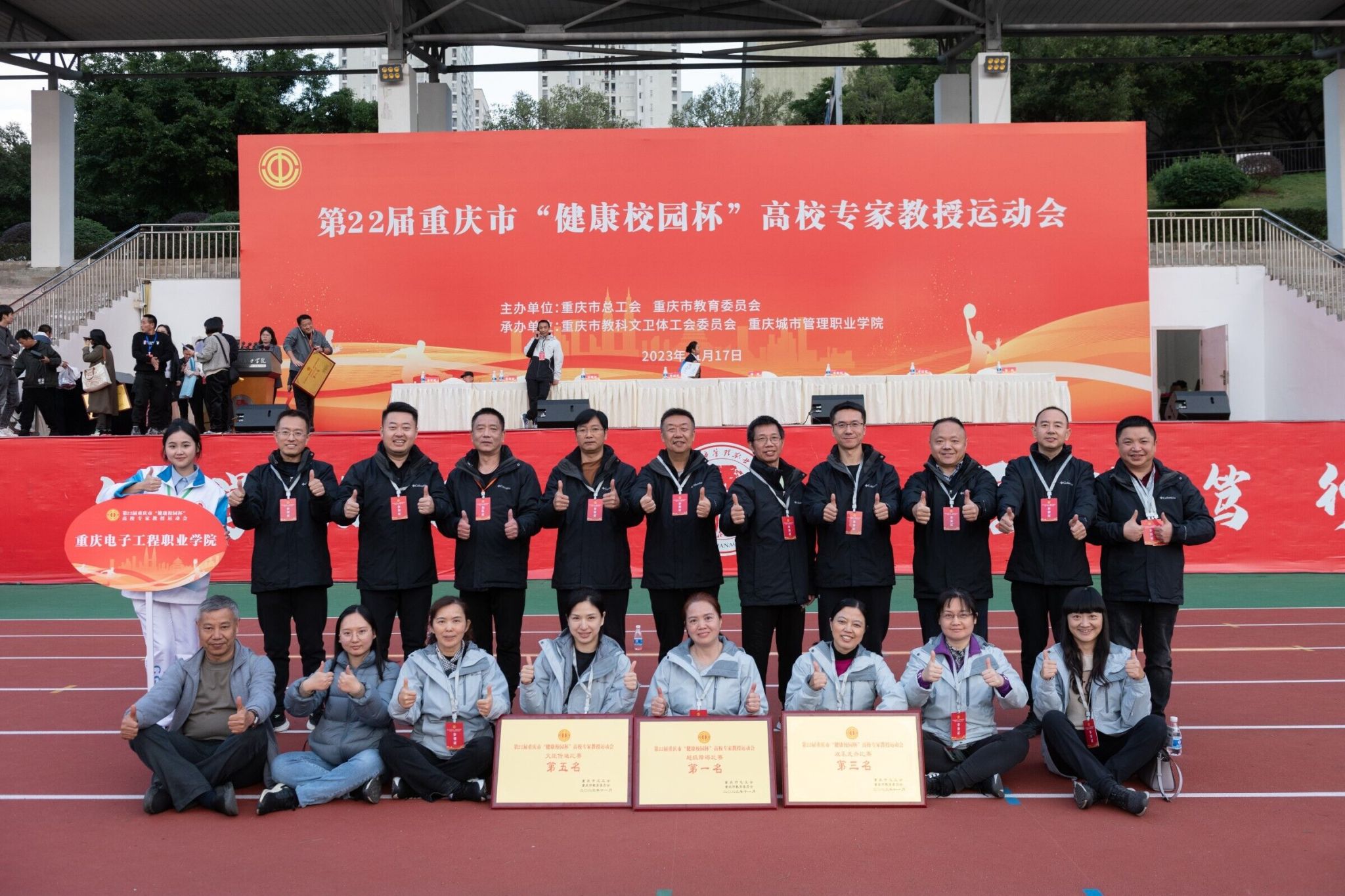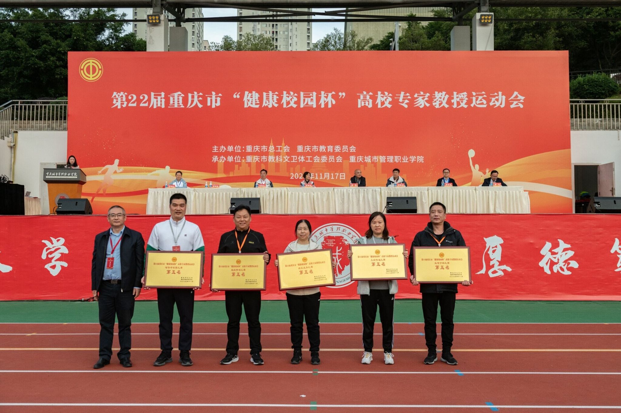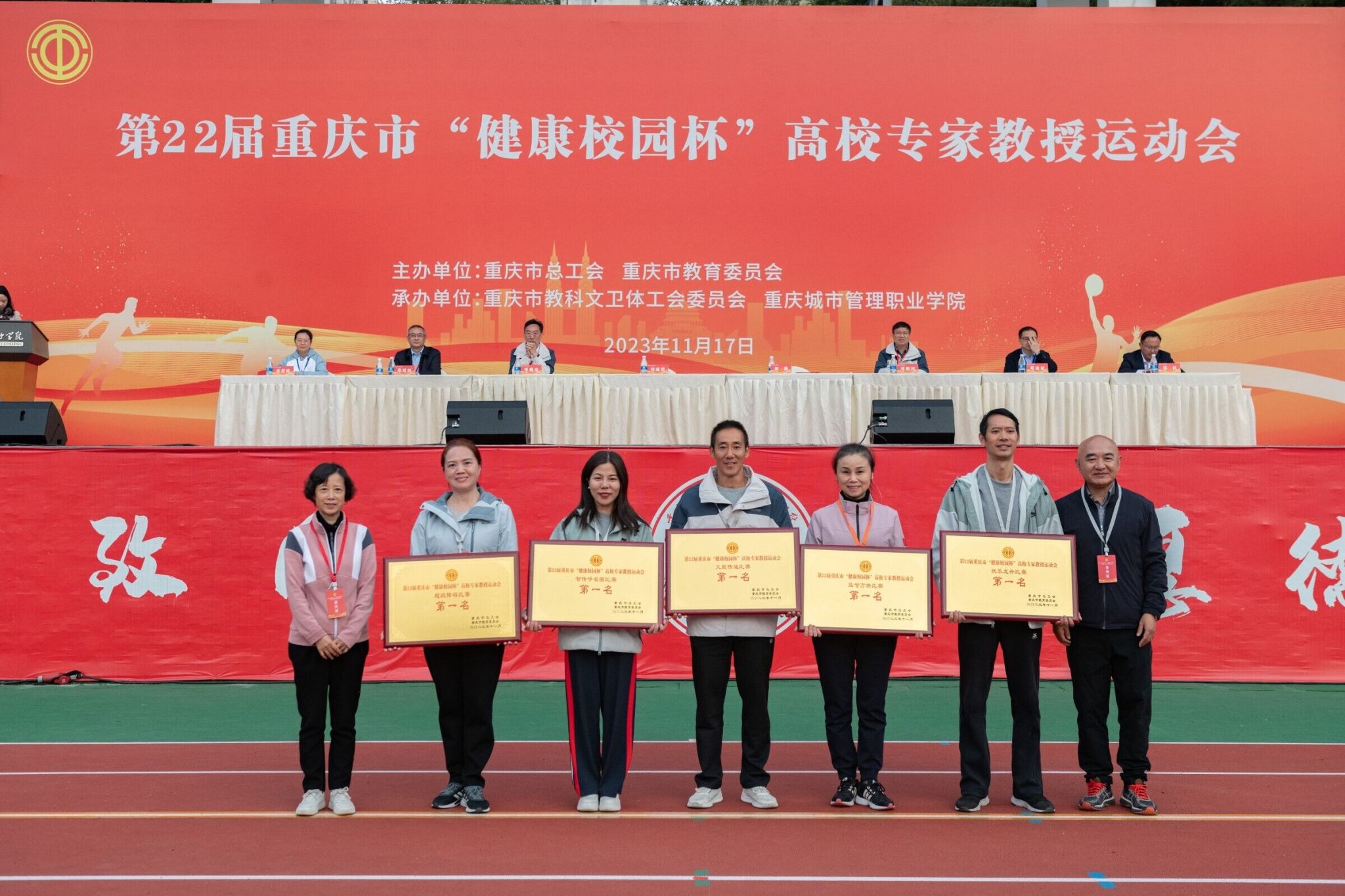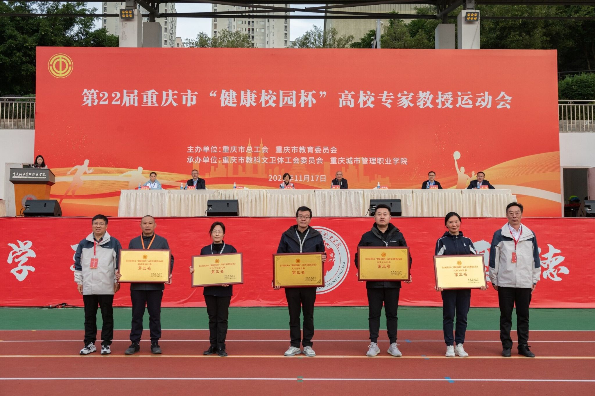 为丰富高校教职工文化生活,增强健康意识,展示高校专家教授精神风采,凝聚思想,增进交流,11月17日,由市委教委、市总工会主办,市教科文卫体工会承办的第22届重庆市“健康校园杯”高校专家教授运动会在重庆城市管理职业学院隆重举行,参加比赛的有来自市委教育工委和全市35所高校的36支队伍共计八百多运动员。党委书记孙卫平教授、副校长冉学农教授率领我校代表队参加了本次运动会。
