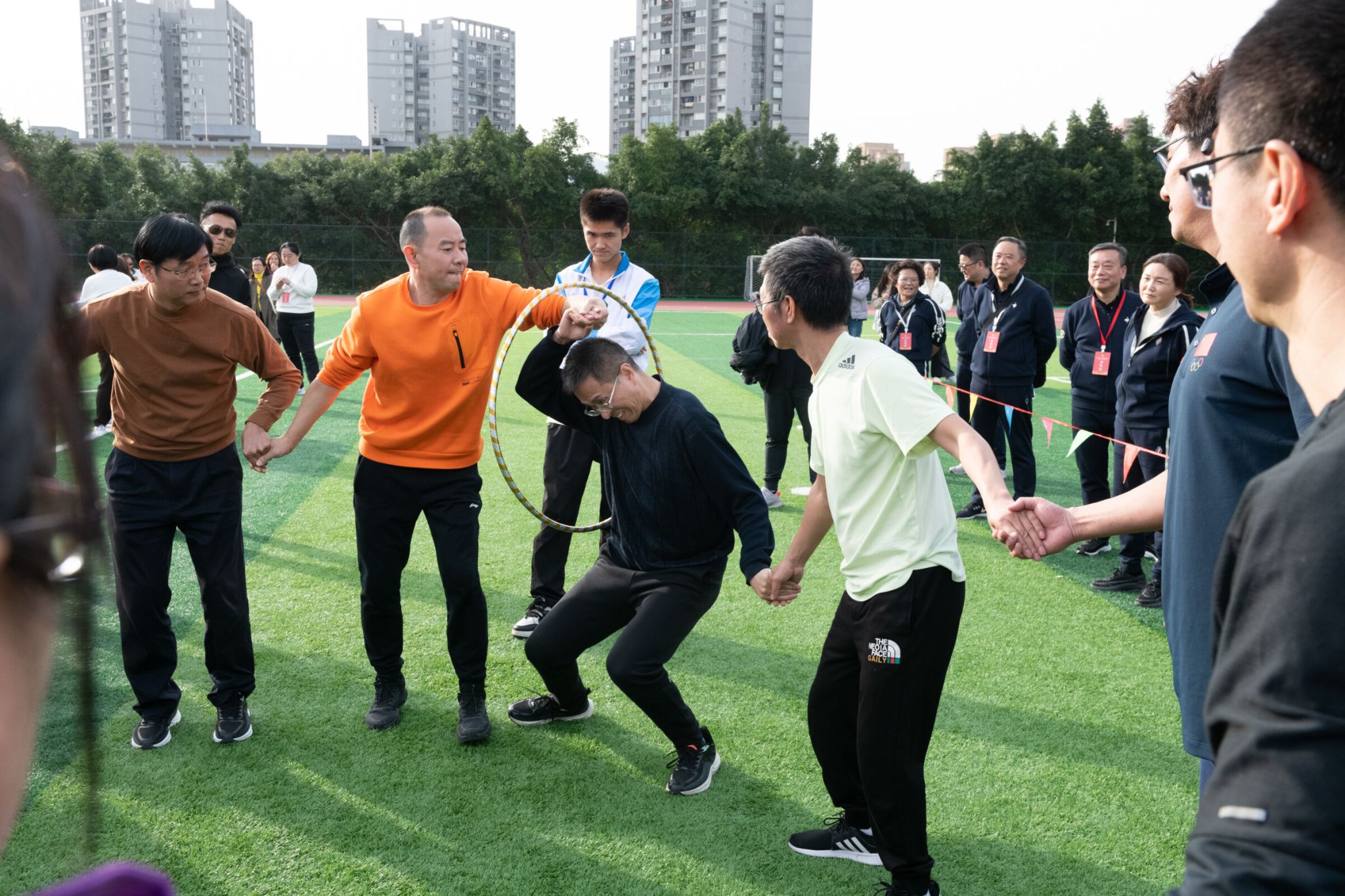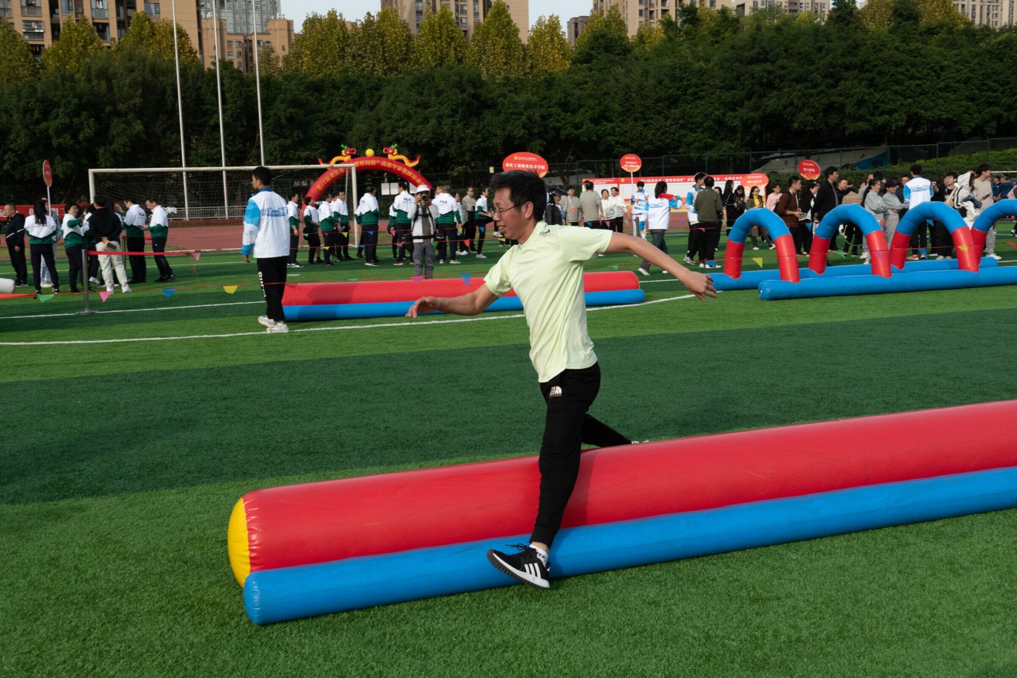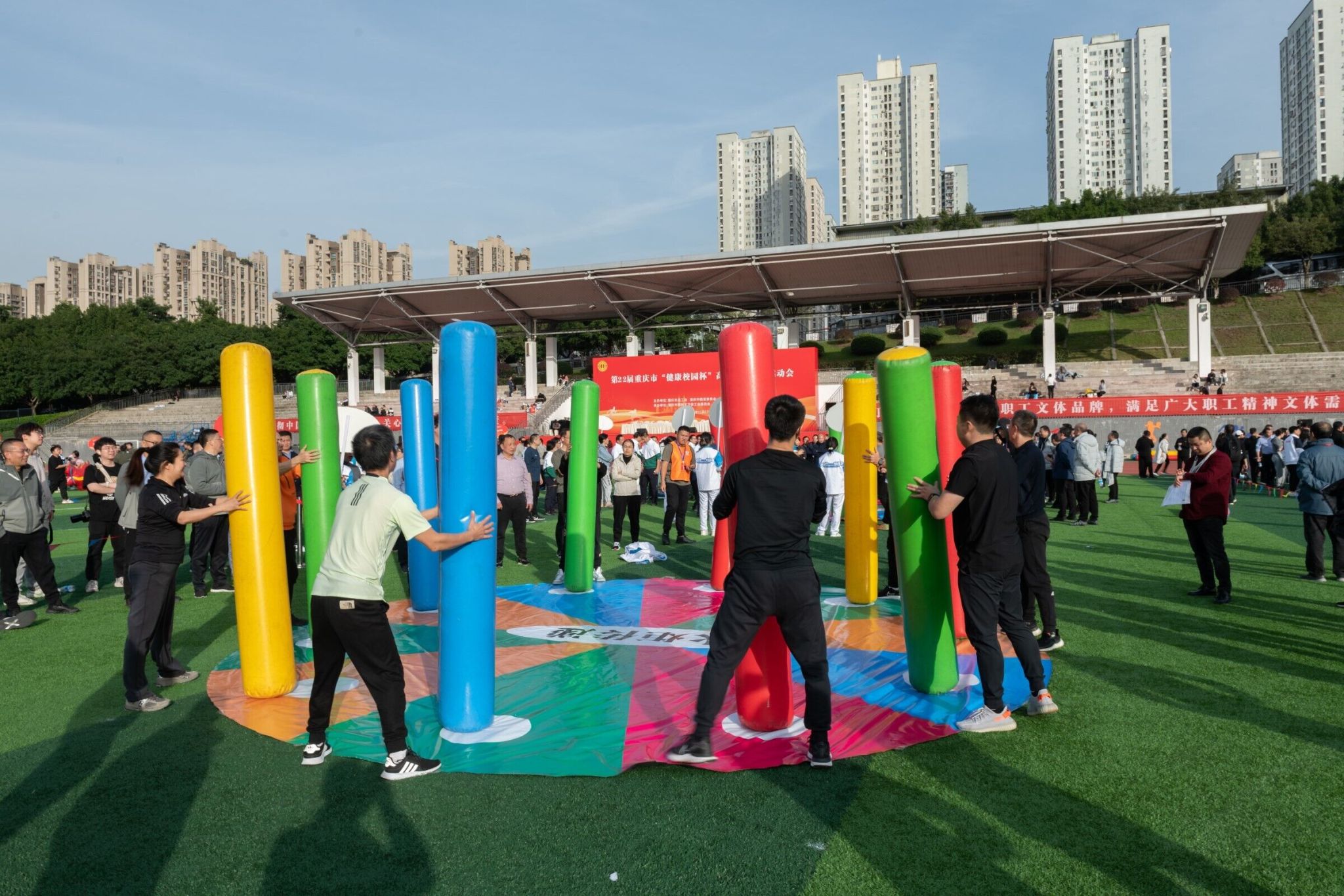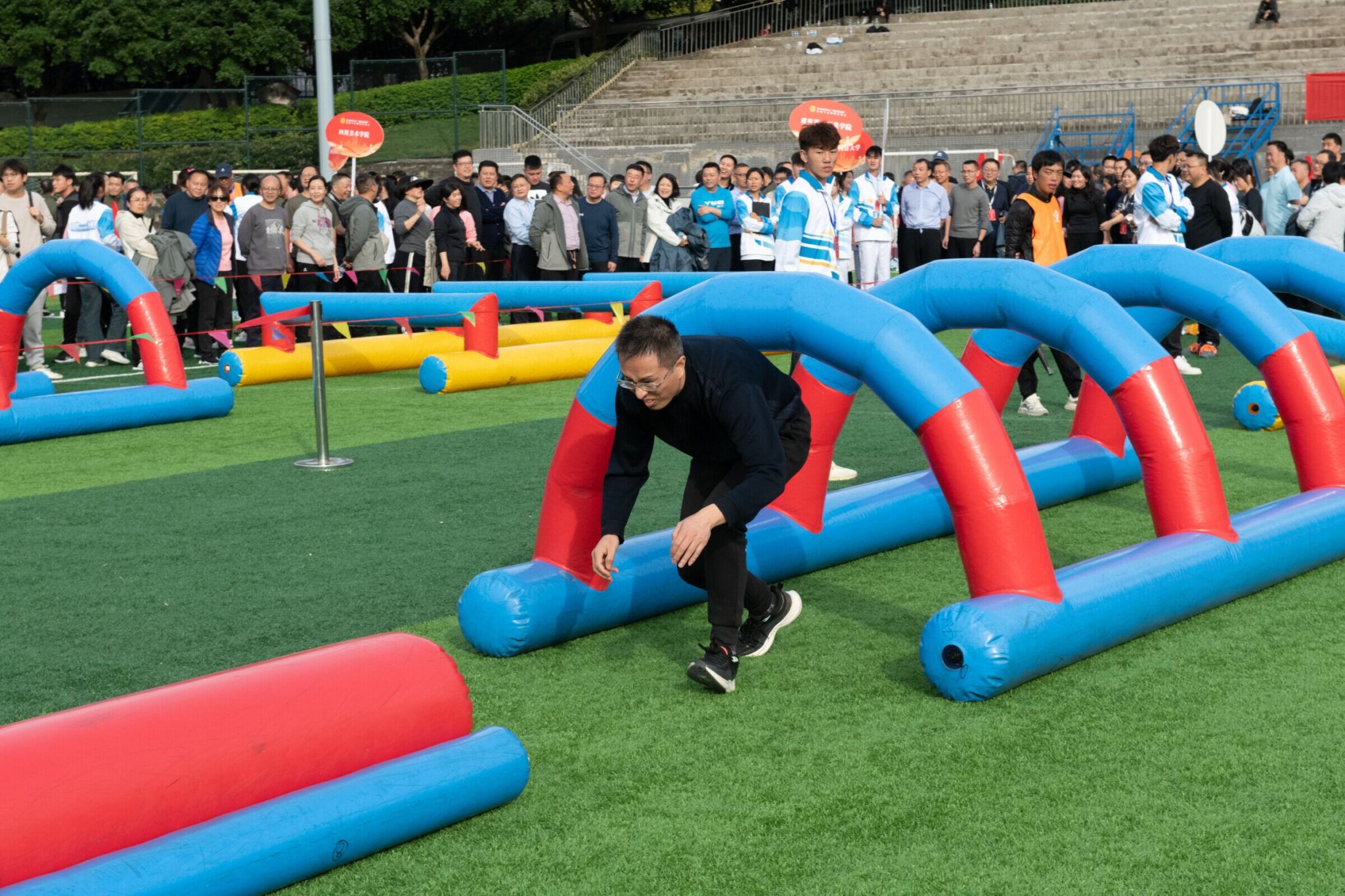 开幕式结束后运动会比赛项目正式开始。各参赛队先后分组进行了超级障碍赛、益智方块、智传呼啦圈、欢乐龙舟、火炬传递等五个项目的比赛。全体队员团结协作、奋力拼搏,赛出了风格,赛出了水平,经过两个多小时激烈角逐,我校代表队在团体广播体操展示和五个比赛项目中表现出色,最终获得了超级障碍比赛第一名,欢乐龙舟比赛第三名,火炬传递比赛第五名的好成绩,充分展示了我校专家教授良好的身体素质和拼搏向上的精神风貌。