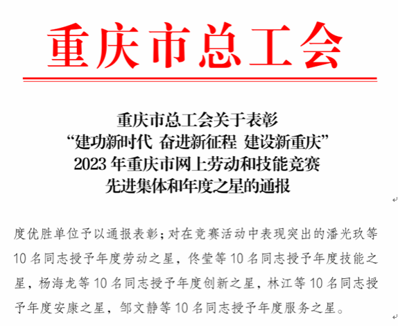 为贯彻落实《关于推进新时代重庆产业工人队伍建设改革的实施意见》,大力弘扬劳模精神、劳动精神、工匠精神,培养和造就一支有理想守信念、懂技术会创新、敢担当讲奉献的产业工人队伍,根据《中华全国总工会办公厅关于深入开展“十四五”全国引领性劳动和技能竞赛的通知》精神,近日,重庆市总工会组织开展了“建功新时代 奋进新征程 建设新重庆”2023 年重庆市网上劳动和技能竞赛,重庆电子工程职业学院智能制造与汽车学院教师佟莹荣获了2023年重庆市网上“劳动和技能竞赛技能之星”称号。