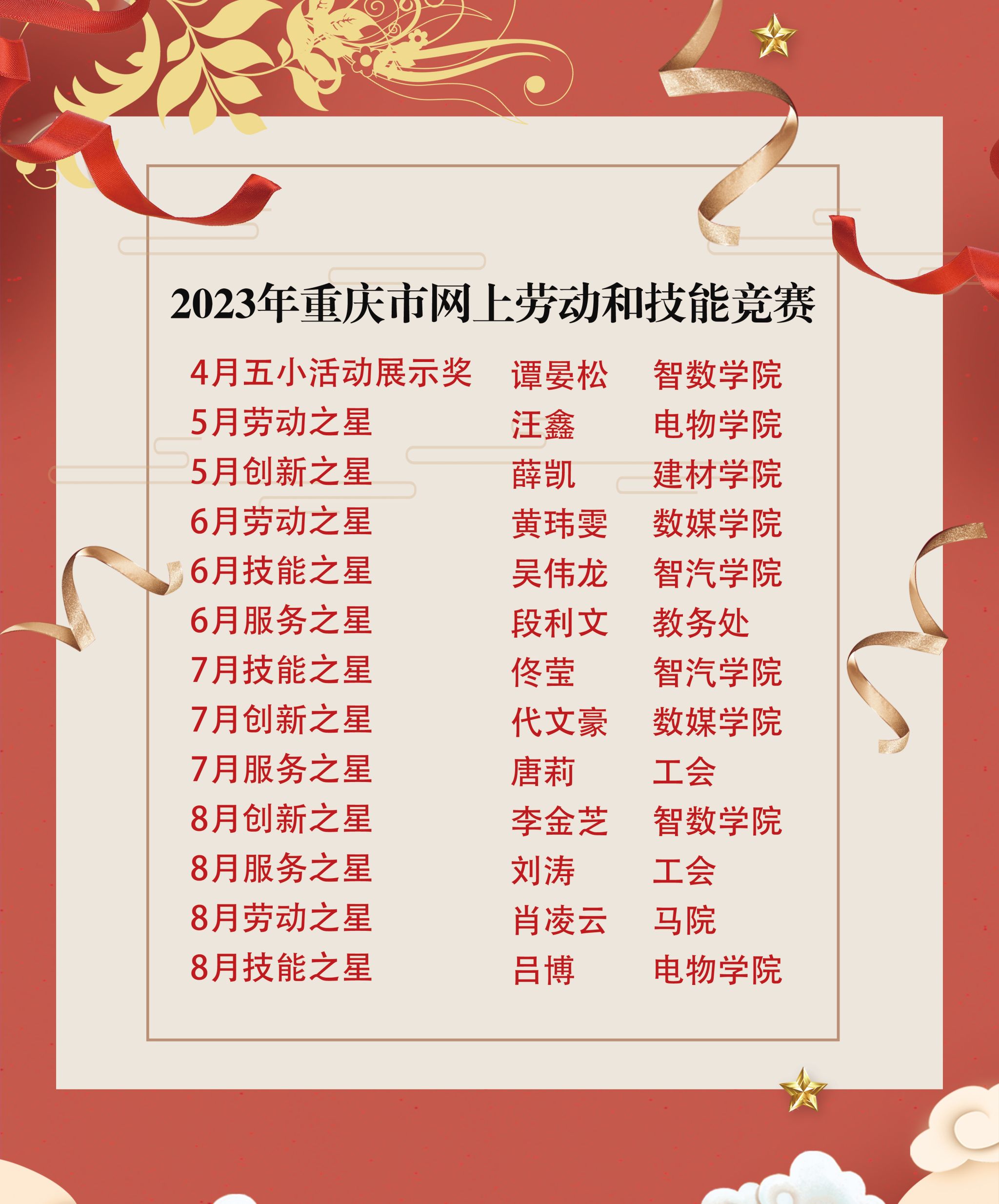 建筑与材料学院教师薛凯等14名教职工,荣获2023年重庆市网上劳动和技能竞赛“月度之星”。