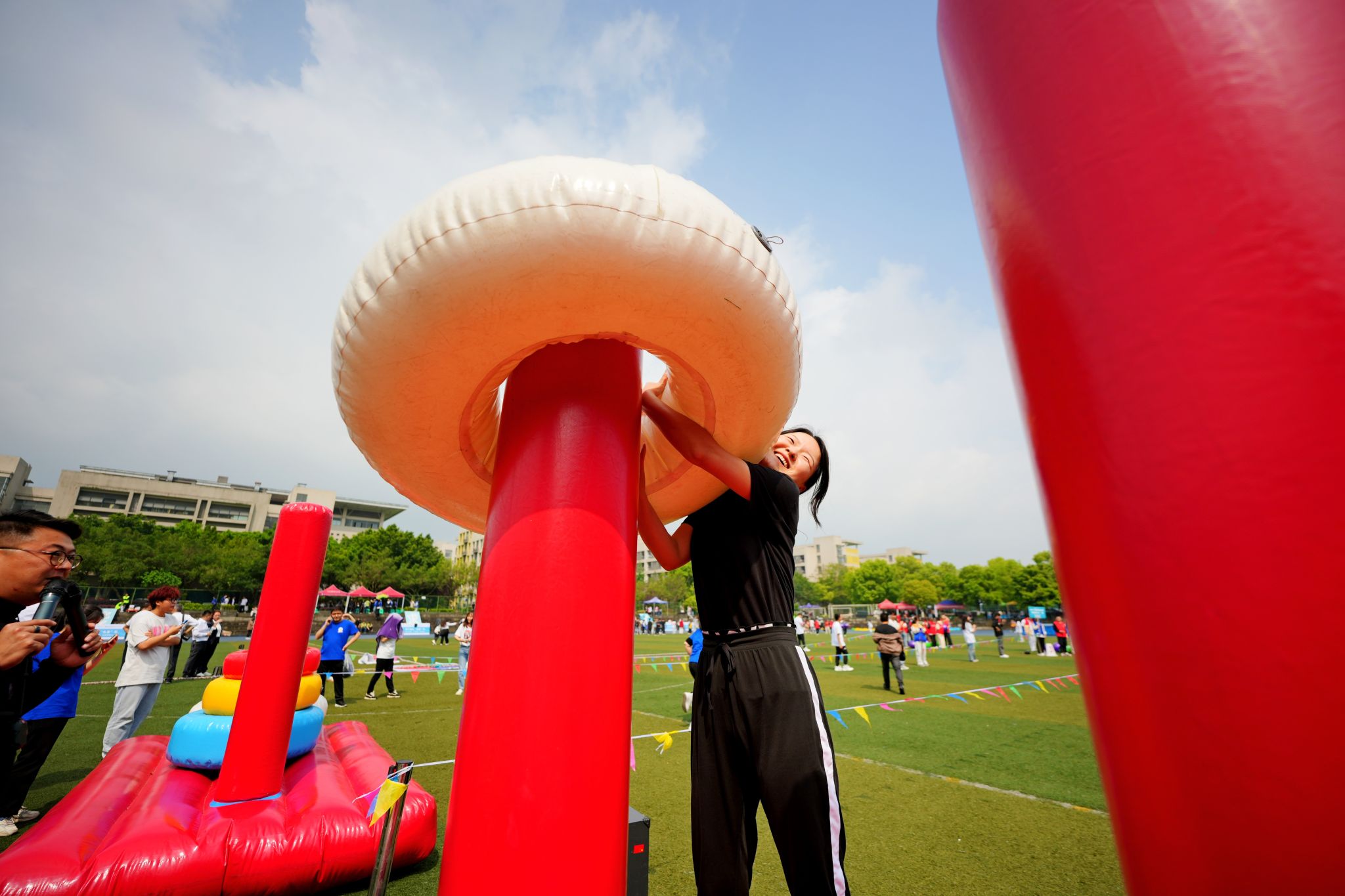 体操展示环节结束后,教职工们积极地参与了各个项目,在超级障碍赛、智慧汉诺塔、万众一心、多项拔河等四个项目中,欢呼声此起彼伏,教职工们活跃的比赛热情洋溢在操场上。