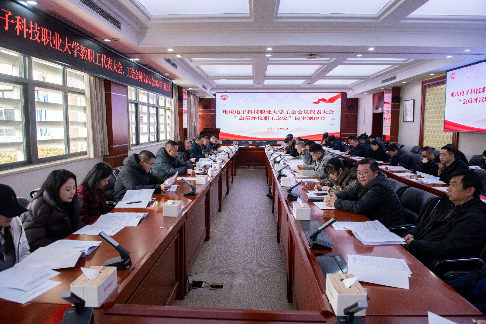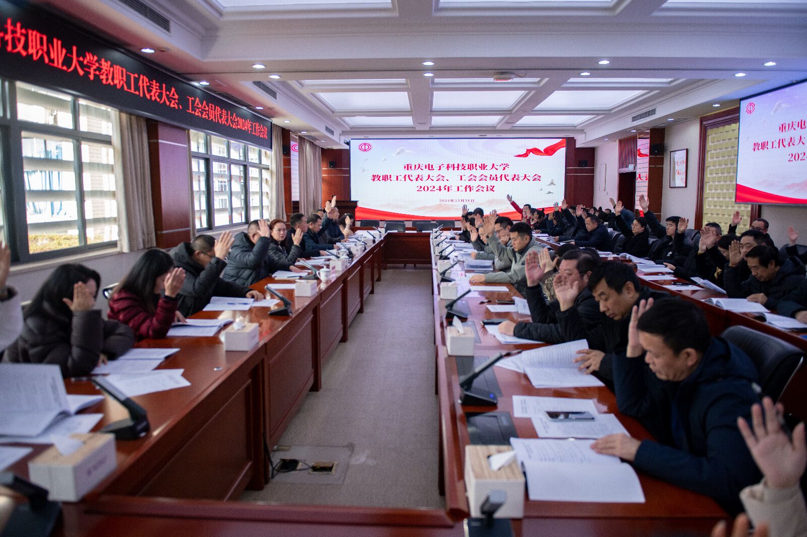岁末年初,时节如流,新年踏歌而来,2024 年 12 月 31 日,重庆电子科技职业大学教代会、工代会 2024 年年度工作会议在博润厅召开。校党委副书记龚小勇,副校长黄爱明,副校长刘洪光,以及全体教职工代表、工会会员代表参加会议。会议由教代会执行委员会副主任、工会副主席吕义清主持。