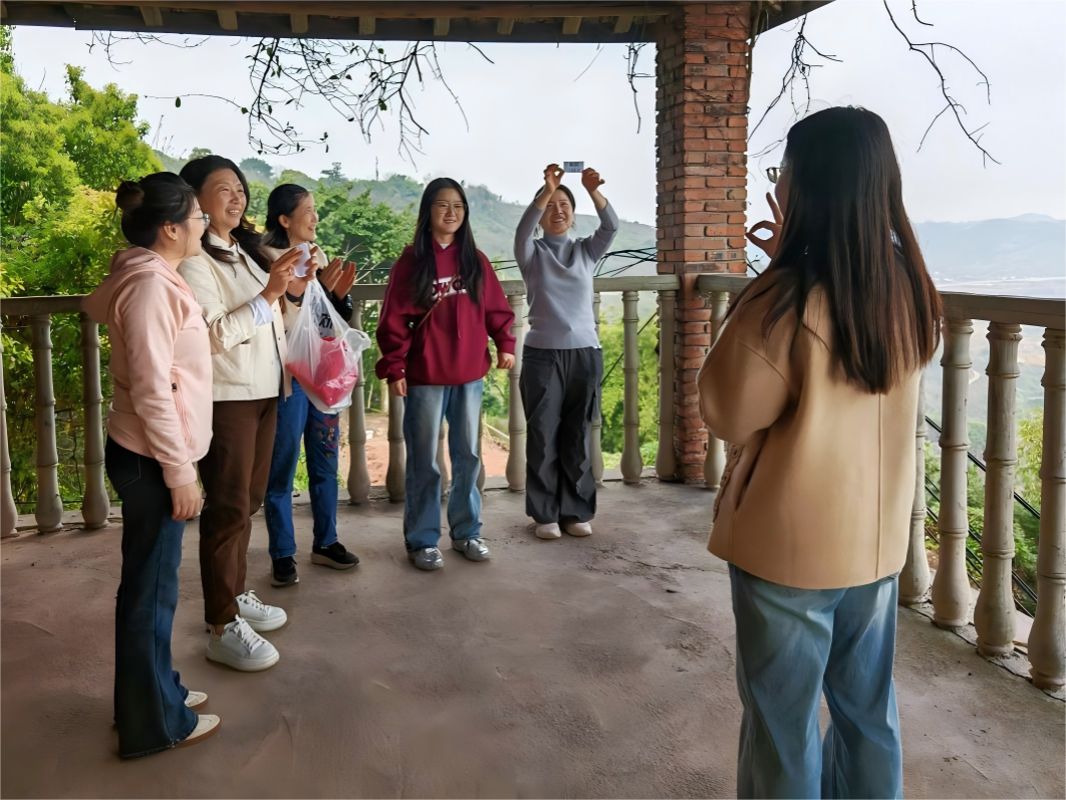 徒步结束,大家在山顶观景长廊结合学校“玫瑰书香”主题,融入书香元素开展趣味互动游戏。通过默契猜词等游戏,检验了大家学习Deepseek实用手册的成果,现场笑声此起彼伏。